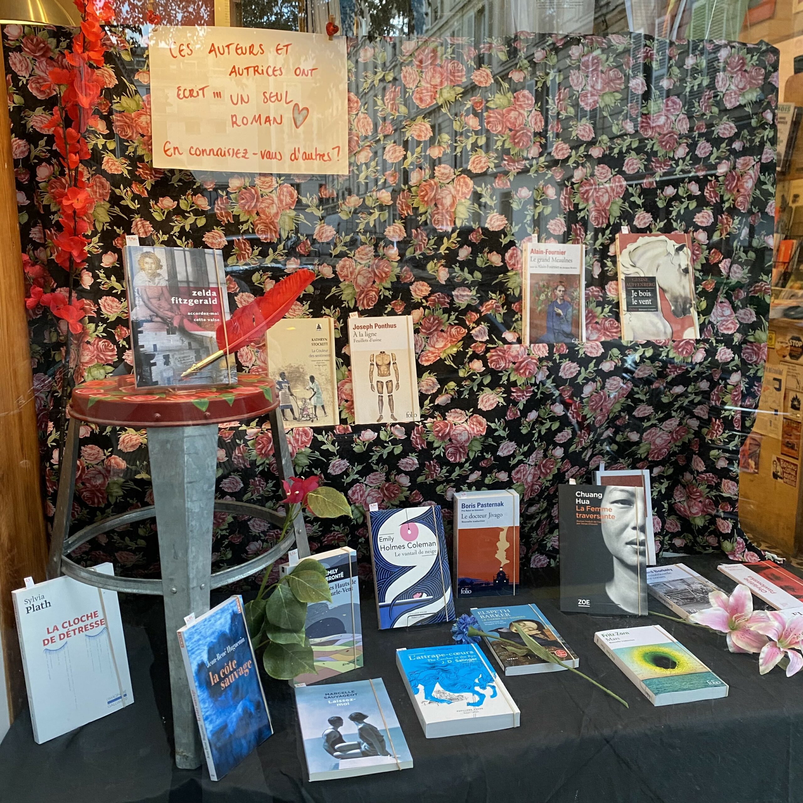 Vous trouverez une sélection « roman unique » ; une sélection inspirée par la réédition d’Écarlate, petit livre bijou d’une autrice flamboyante, Christine Pawlowska, et qui a fait l’objet d’un livre-enquête par Pierre Boisson, Flamme, volcan, tempête, assez incroyable aussi ! Se côtoient sur la table Le Grand Meaulnes, Le Guépard, La Cloche de détresse, etc., textes romanesques dont leur auteur·ice n’a fait qu’un seul essai… mais quel essai !!!